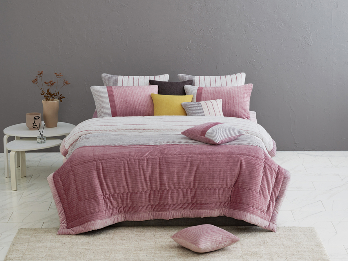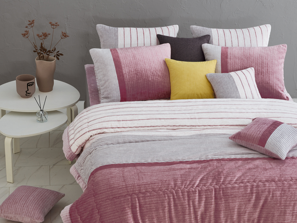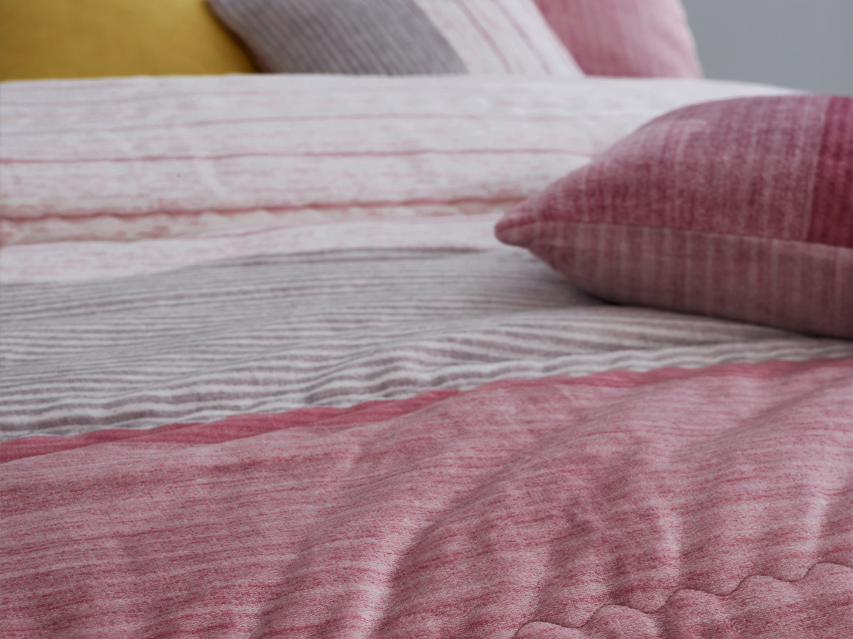 핑크 컬러의 톤온톤 색감과 그레이 스트라이프 패턴이 들어간 세련되고 모던한 침구입니다.