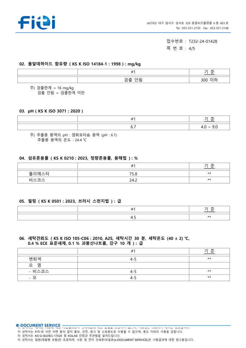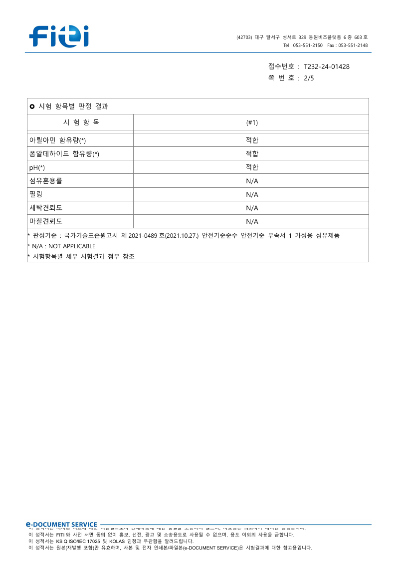 아릴아민 함유량(*)_합격 / 폼알데하이드 함유랸(*) _합격 / PH(*)-합격