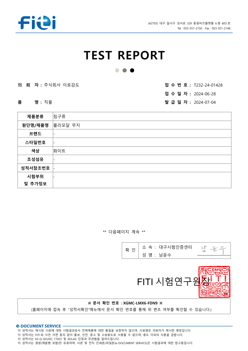 KATRI(한국의류시험연구원) 테스트 결과 ![]() | SWISS TESTEX로 부터 친환경 인증마크인 Oeko-Tex Lable 및 미국 FDA마크 인증 ![]() |