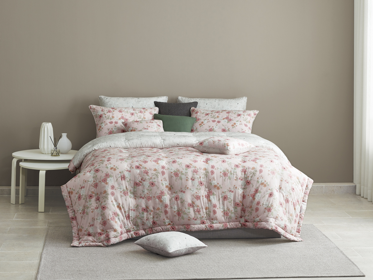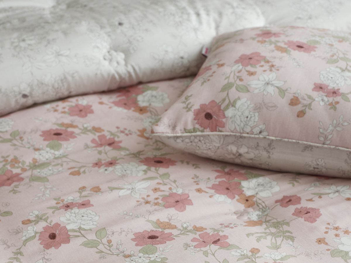 부드러운 핑크 톤을 베이스로, 생기 있는 레드와 오렌지빛 플라워가 조화를 이루며 아늑하면서도 사랑스러운 감성 침실을 완성합니다.