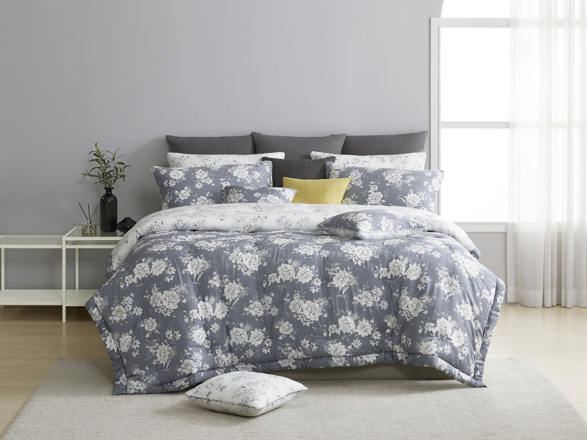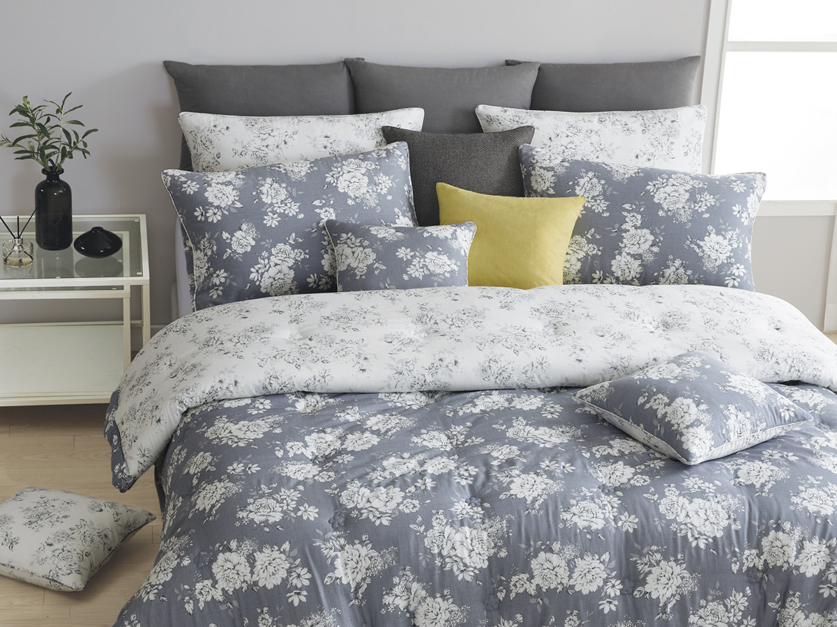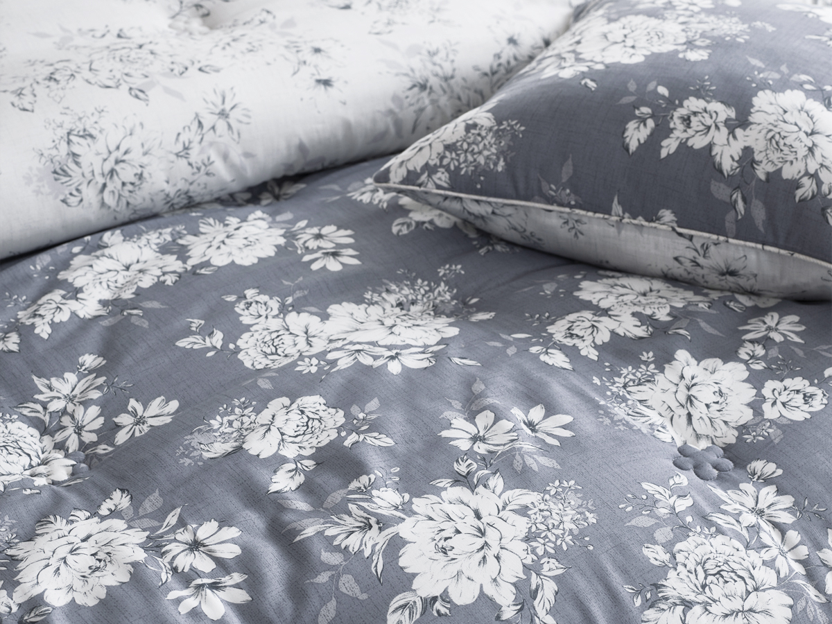차분한 그레이 바탕 위에 화사하게 펼쳐진 화이트 플라워 패턴이 고급스러운 무드를 완성합니다.