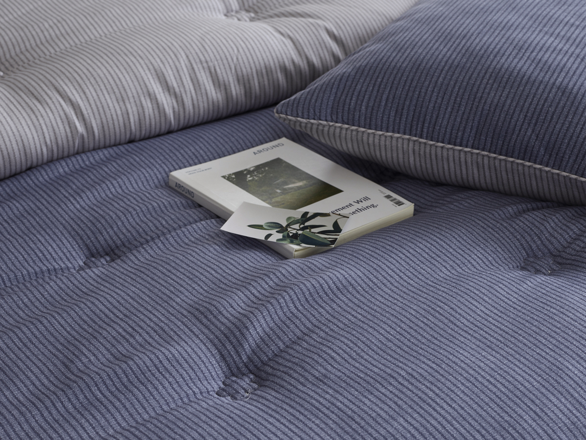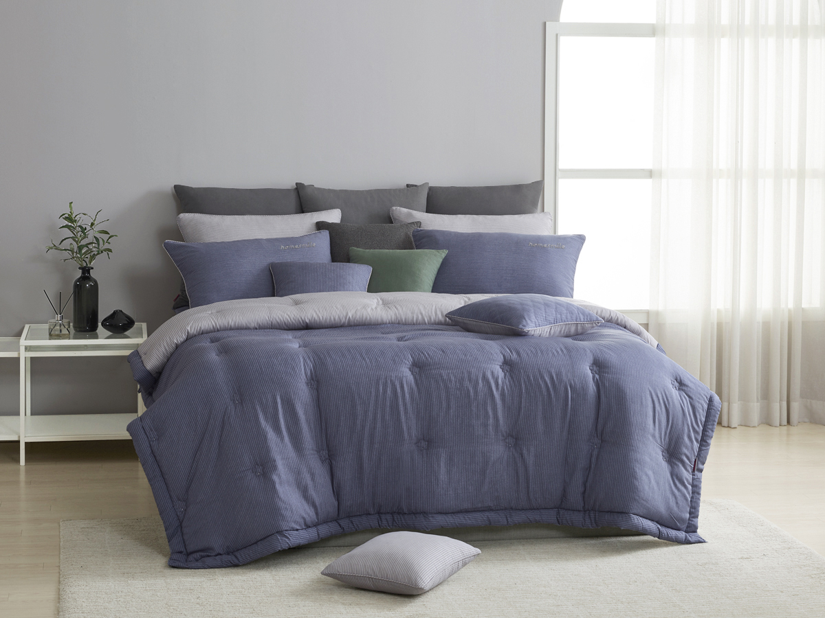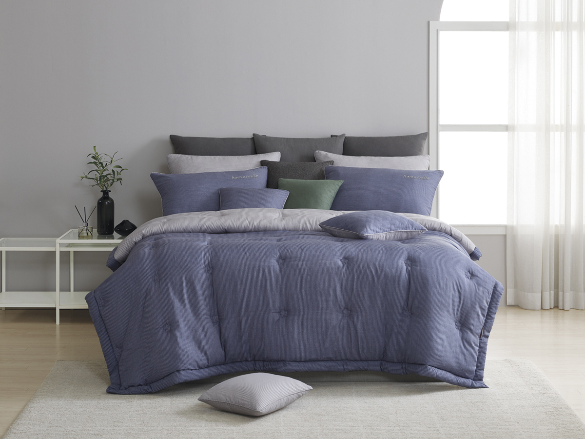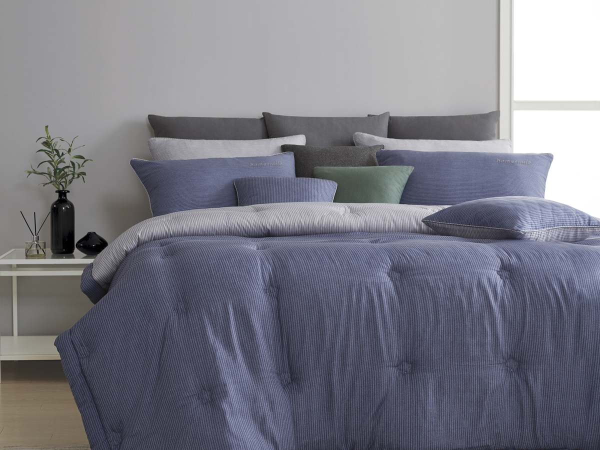 모던한 텍스처를 블루·그레이 톤으로 컬러 매치해 세련된 분위기를 완성한 침구입니다.