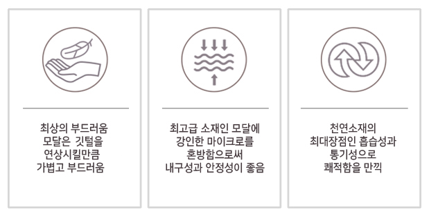 ![]() | 모달 소재의 특장점 - 너도 밤나무에서 추출한 친환경 천연섬유 - 면보다 강하며, 섬유 내구성과 안정성이 뛰어남 - 실크처럼 부드러운 터치의 탁월한 촉감 - 적정한 수분조절 기능과 뛰어난 통기성 ![]() |