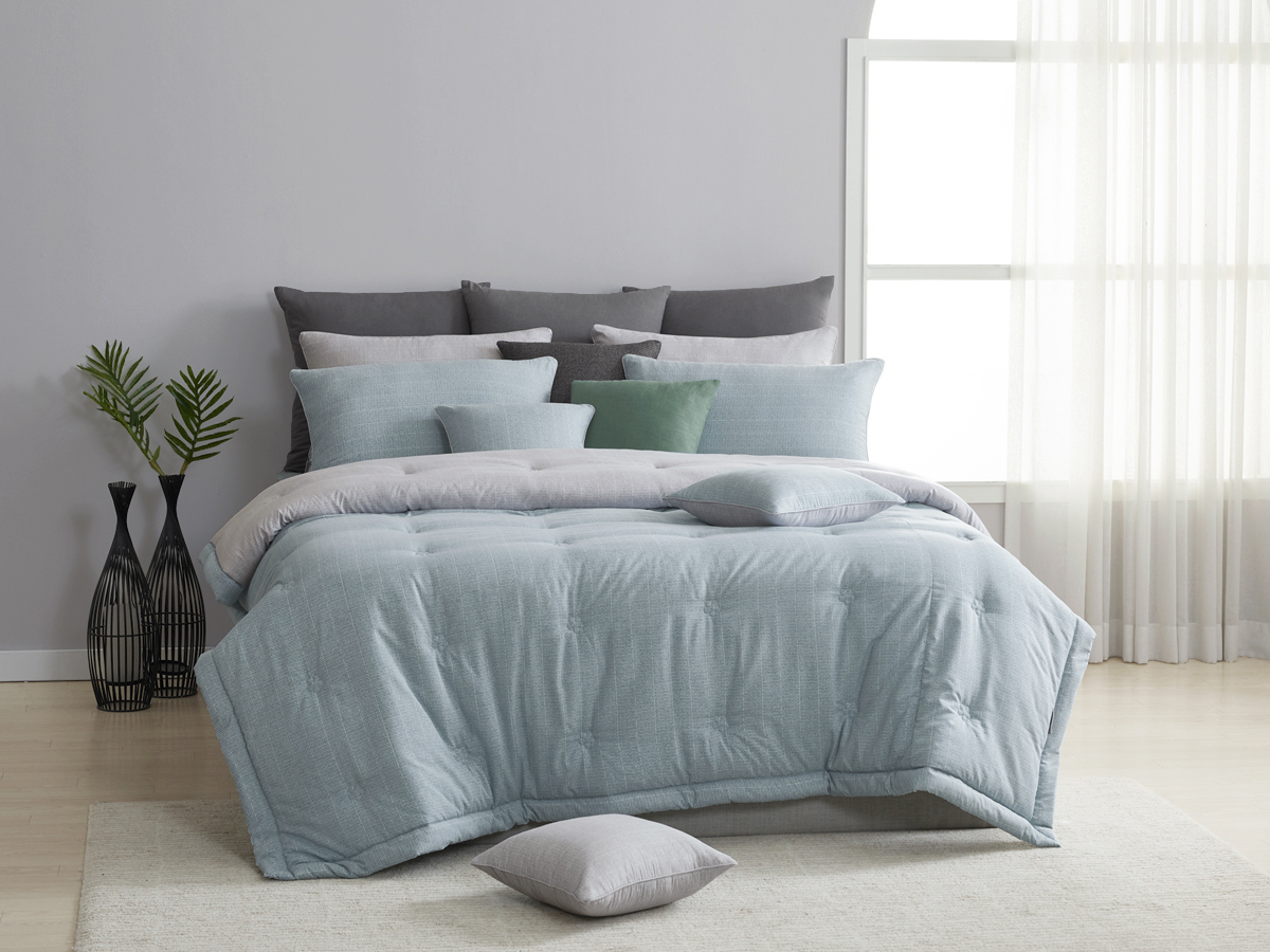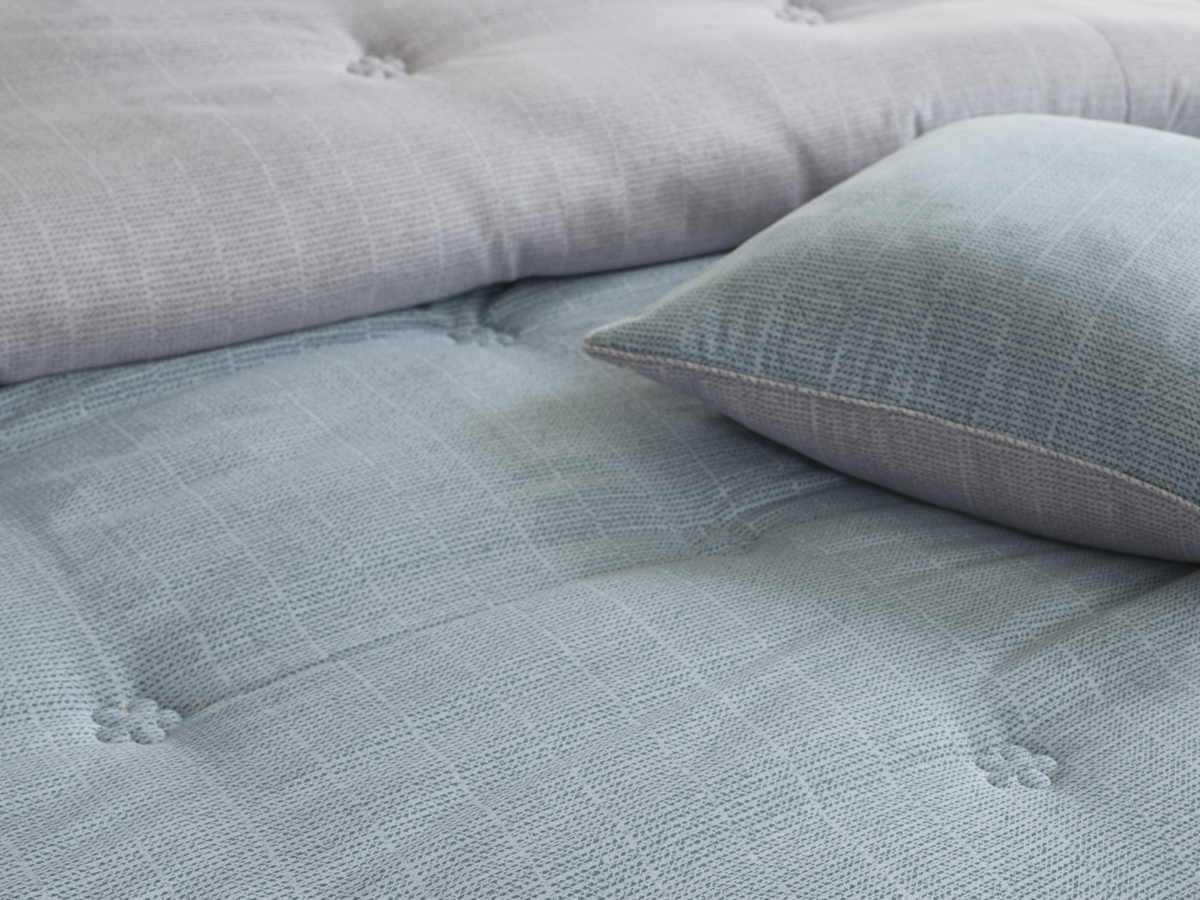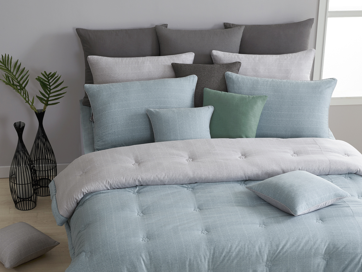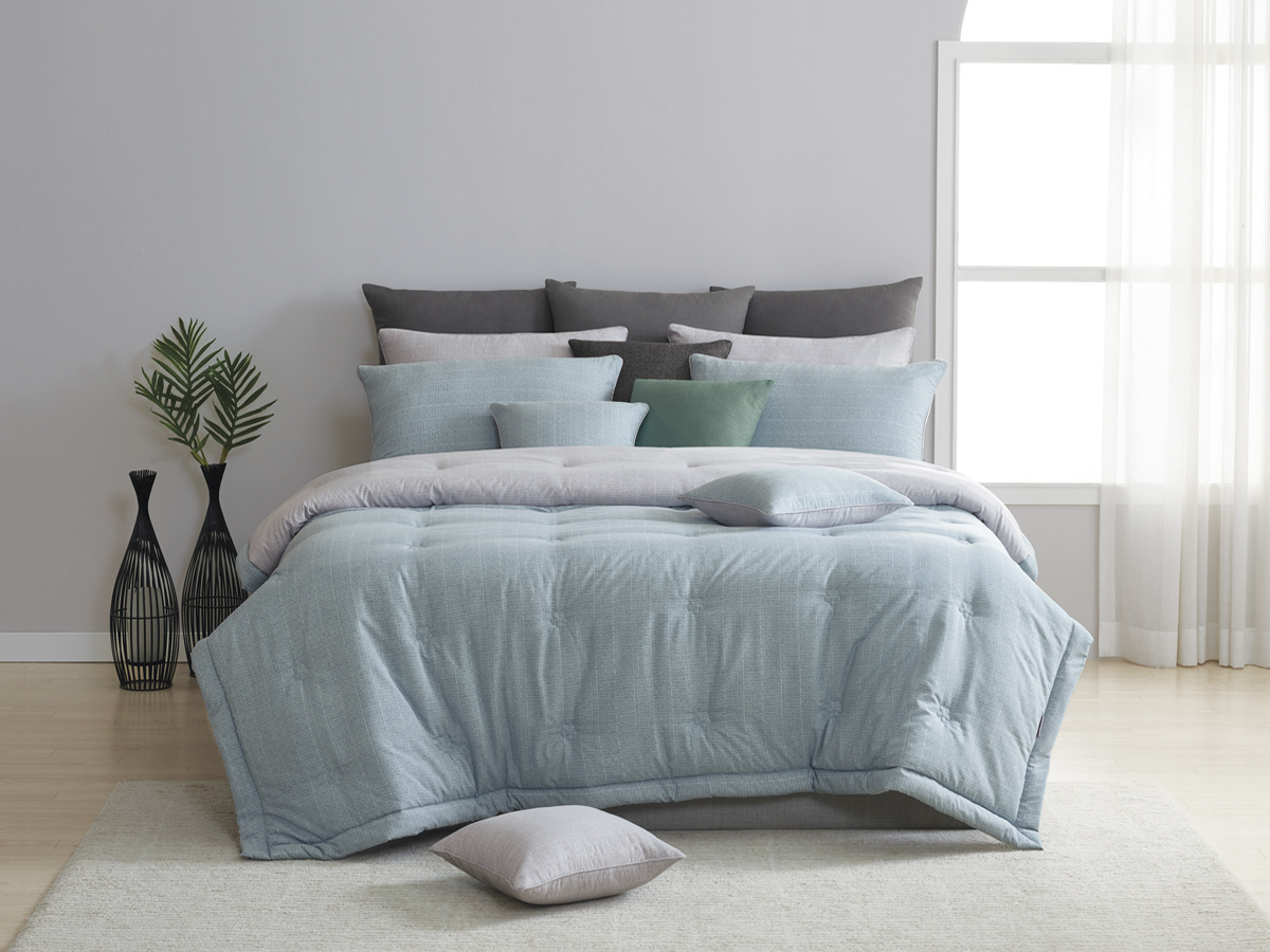 맑은 파스텔 블루 컬러를 메인으로 한 침구로, 스티치 텍스처가 촘촘히 더해져 직조감처럼 보이는 미니멀 패턴이 특징입니다.