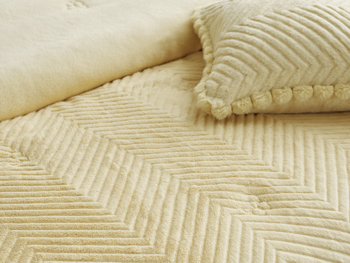 고밀도의 극세사가 선사하는 부드러움 위에, 갈매기 모양의 기하학 패턴을 정교하게 깎아내어 세련된 입체감을 더했습니다.