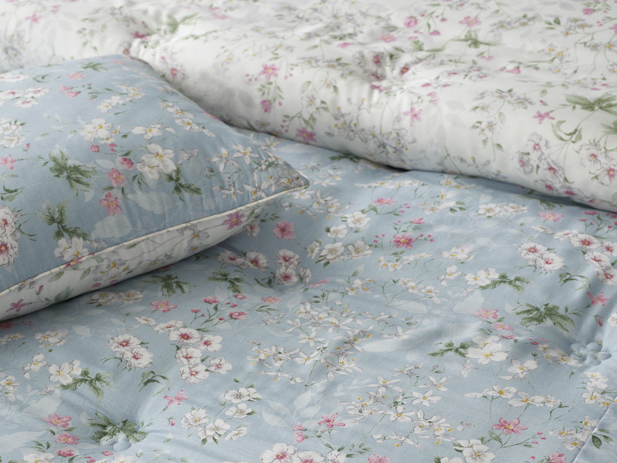 이불 전면에는 작은 들꽃들이 흩날리듯 자연스럽게 배치되어 있습니다.