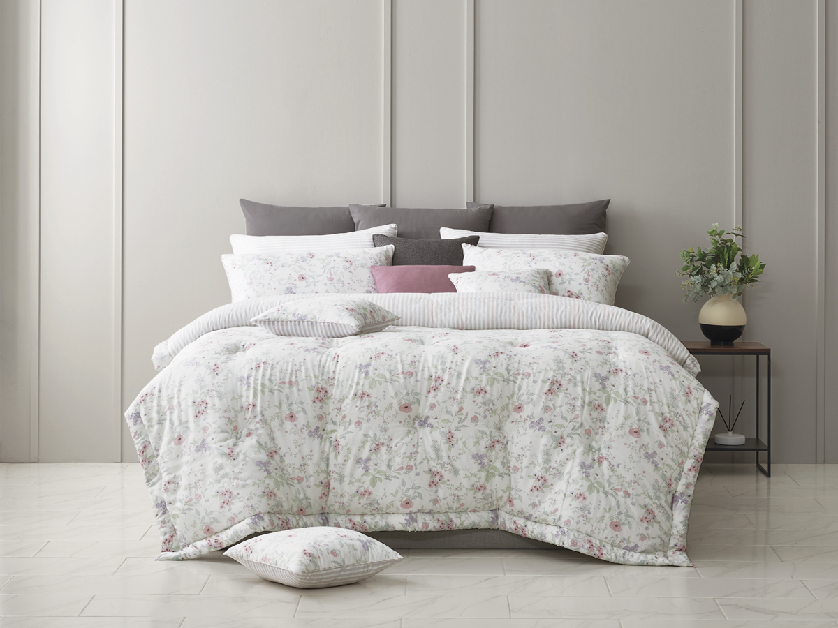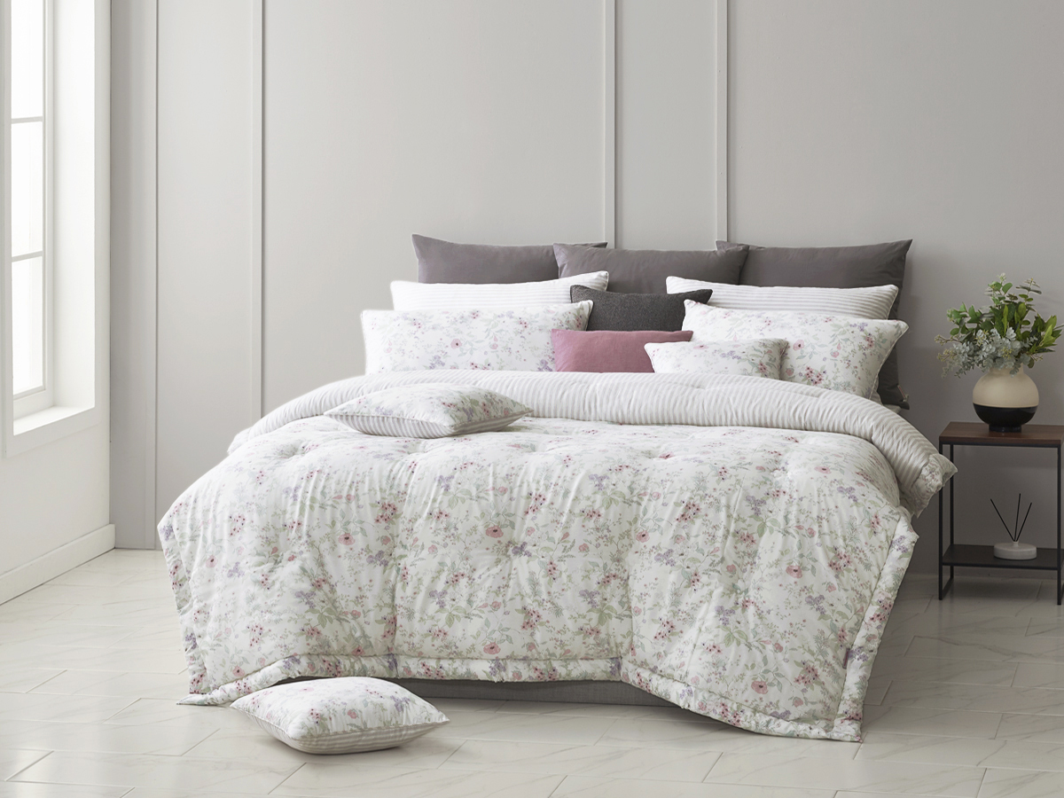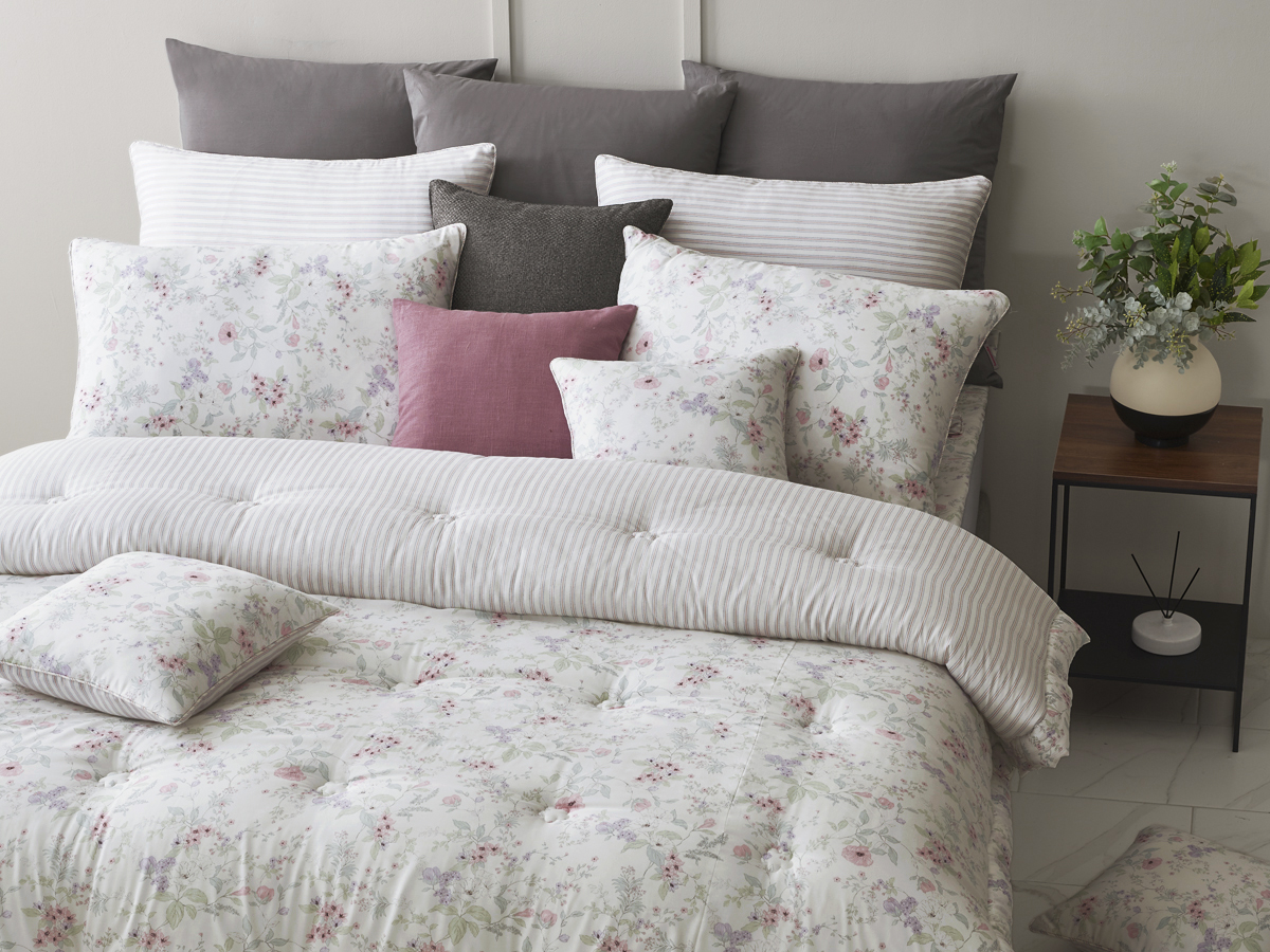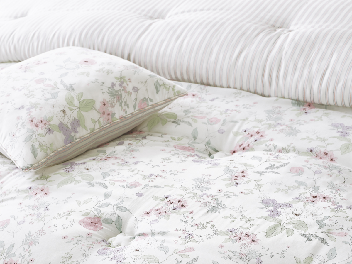 이불을 살짝 접어 연출했을 때 드러나는 스트라이프 디테일은 플라워 패턴에 세련된 리듬감을 더해주며, 기분과 연출에 따라 양면을 자유롭게 활용할 수 있어 실용적입니다.