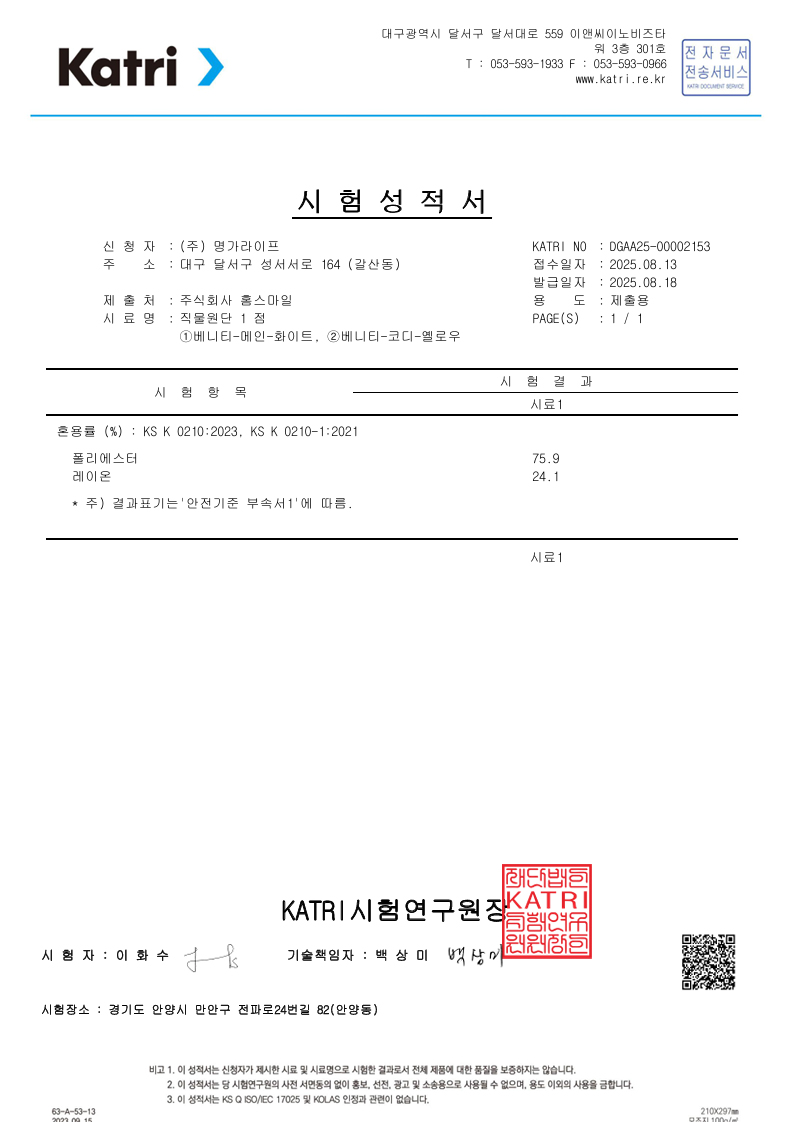 KATRI(한국의류시험연구원) 테스트 결과 ![]() | SWISS TESTEX로 부터 친환경 인증마크인 Oeko-Tex Lable 및 미국 FDA마크 인증 ![]() |