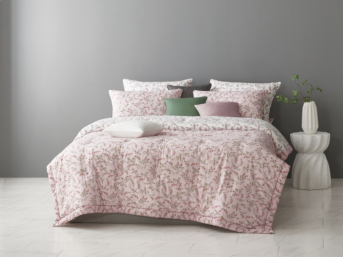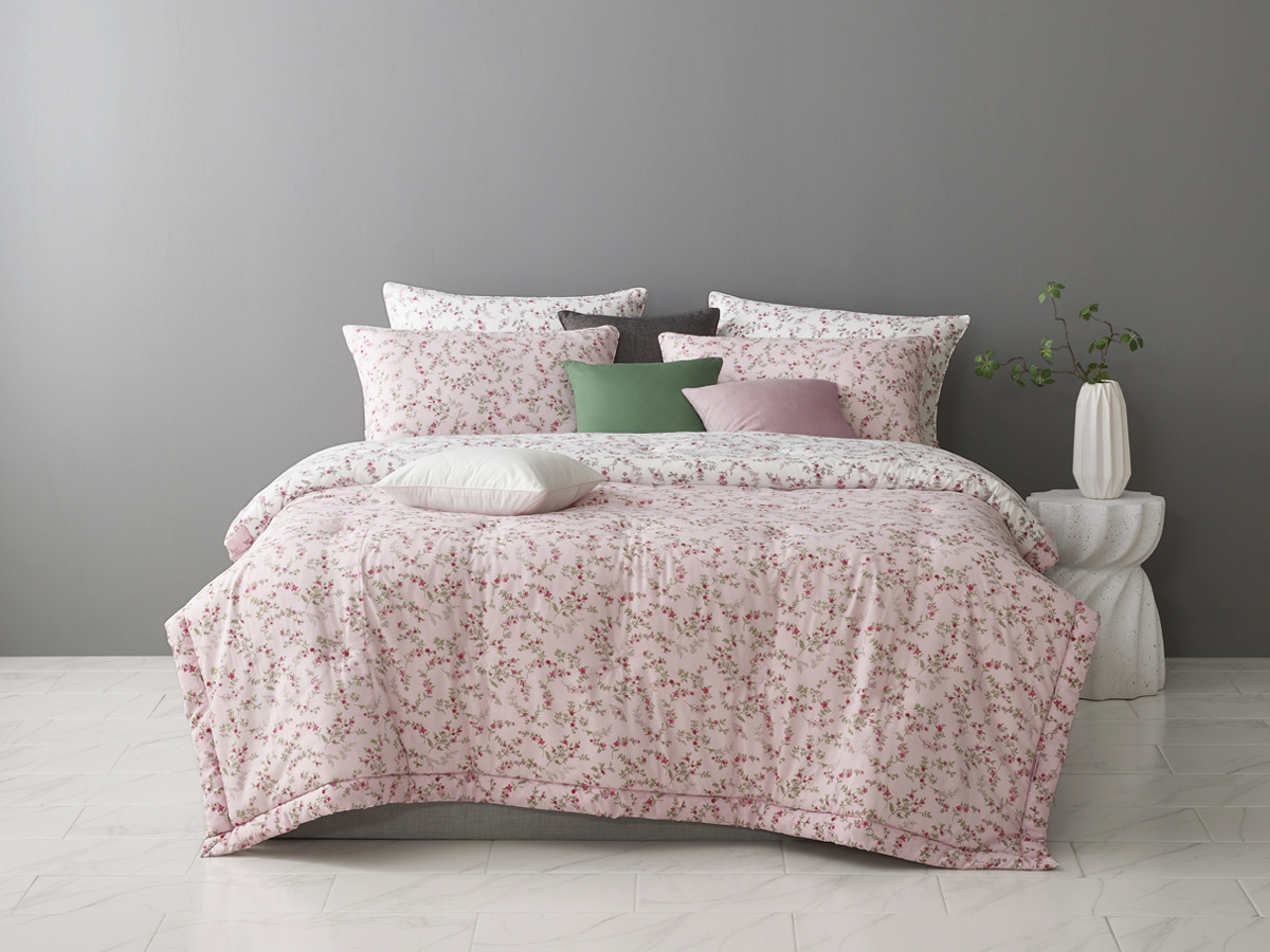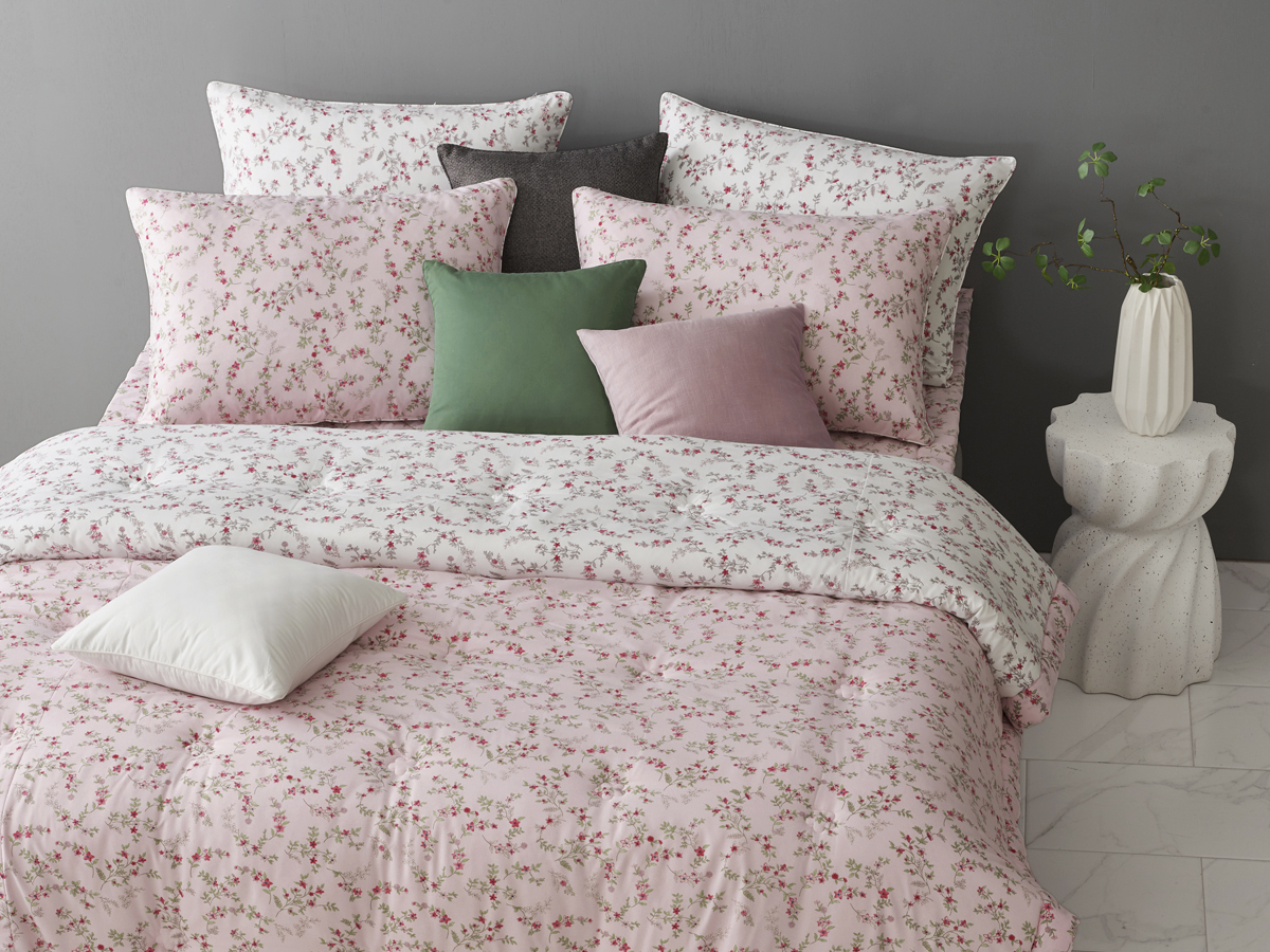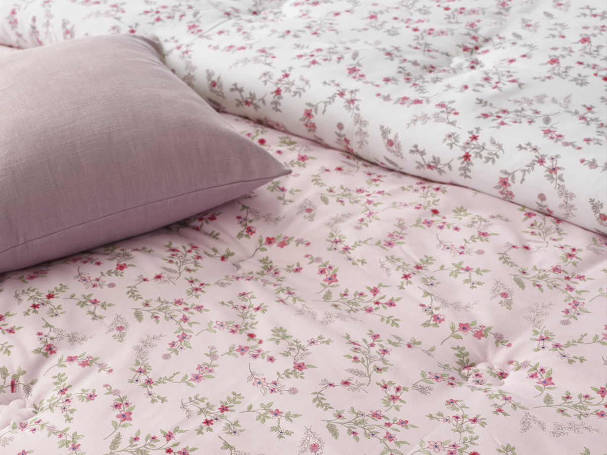 잔잔하게 퍼지는 플라워 패턴은 공간을 답답하게 만들지 않으면서도 침대 위를 풍성하게 채워주며, 마치 봄날의 정원을 연상시키는 자연스러운 분위기를 연출합니다.