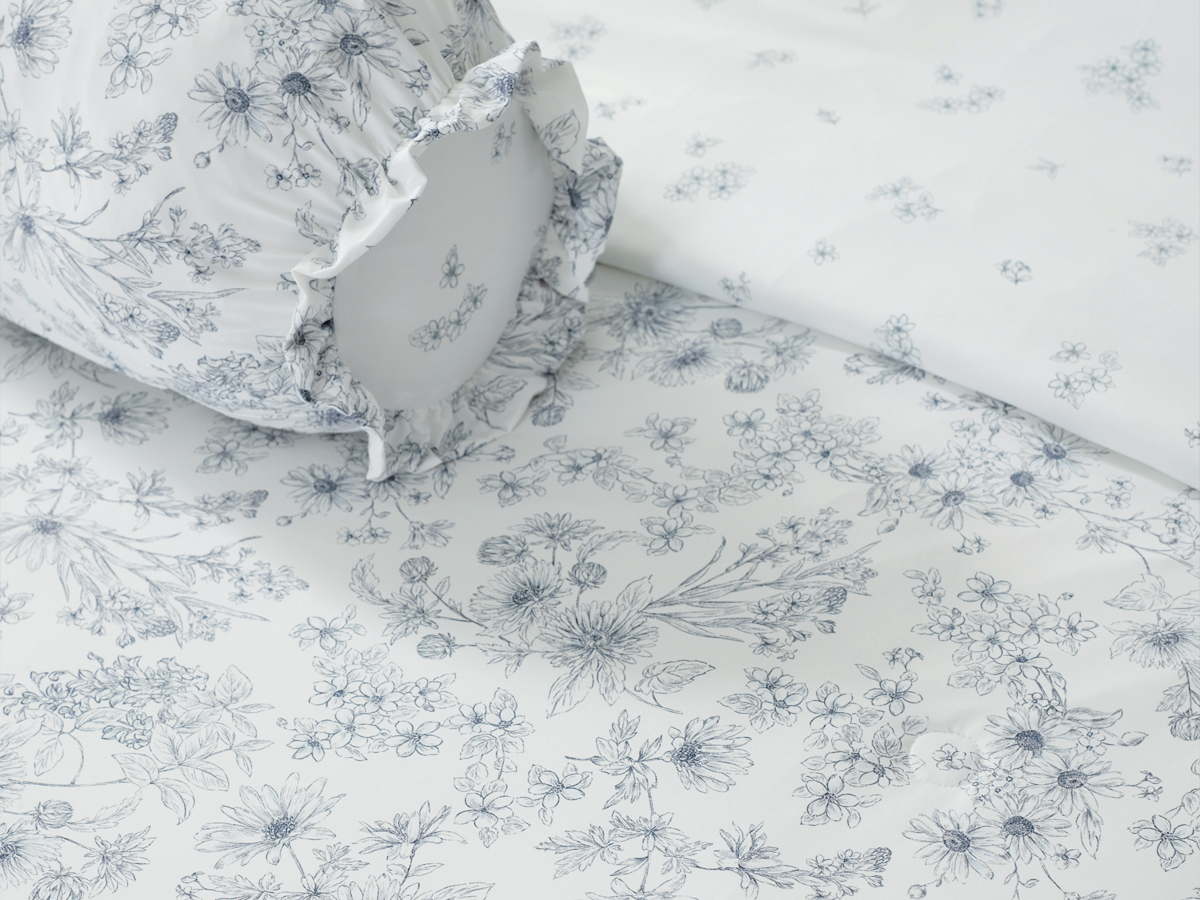 깨끗한 화이트 바탕에 섬세한 블루 플라워 드로잉을 더해 침실에 싱그러운 생기를 불어넣습니다.