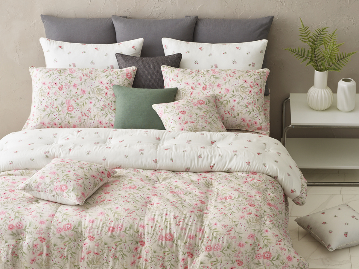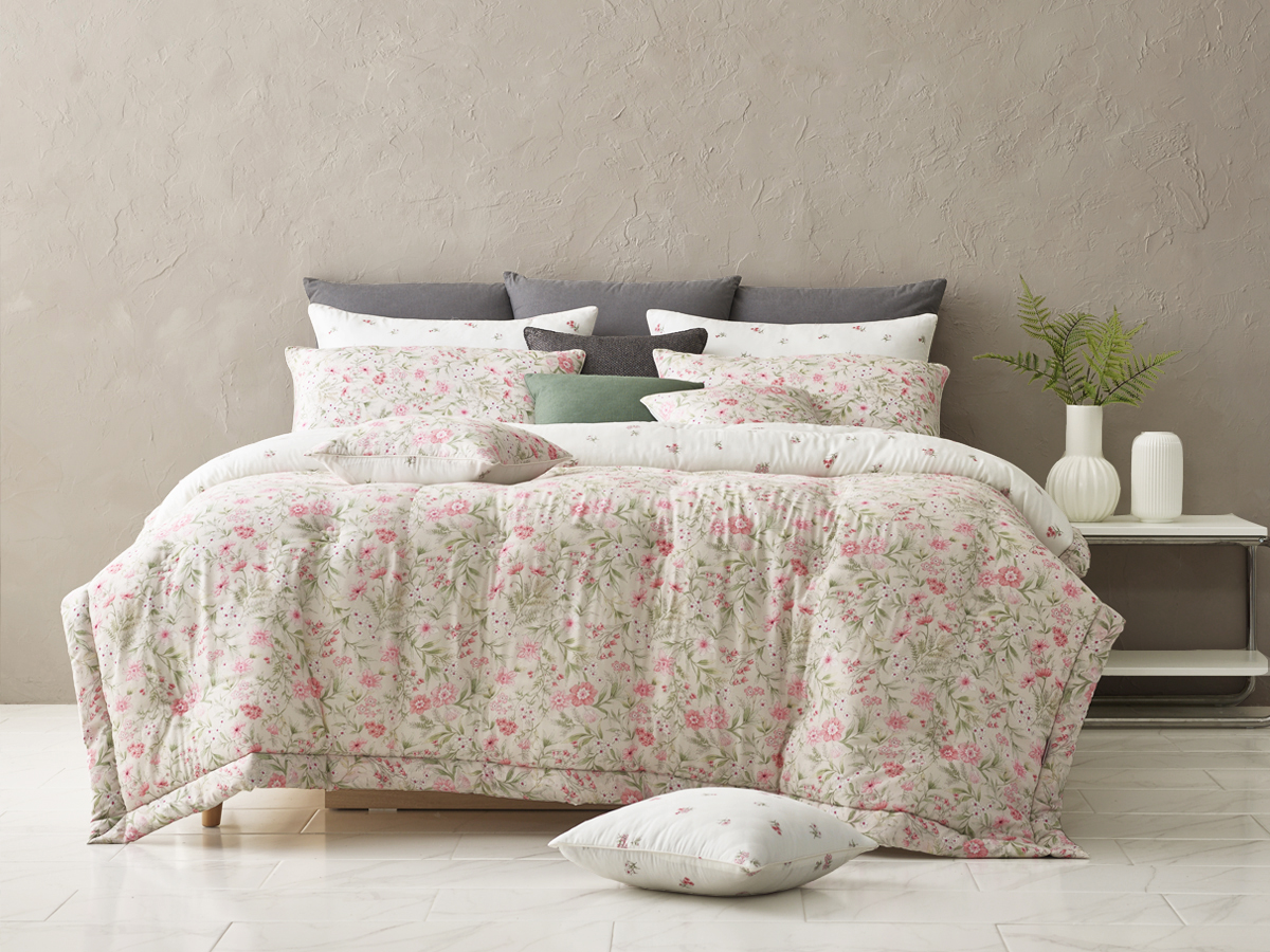 차분한 느낌의 베이지 그라운드와 디테일하고 화려한 핑크 플라워 패턴으로 고급스럽고