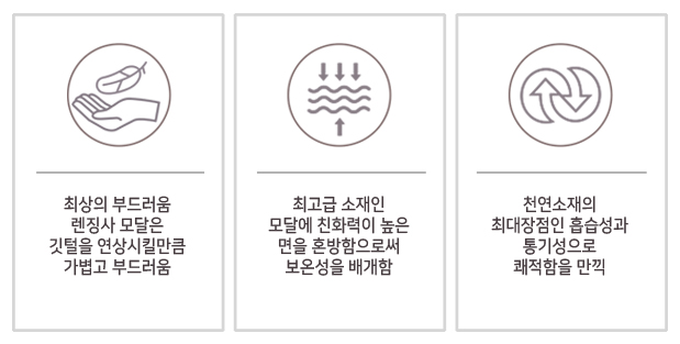 ![]() | 모달100% 소재의 특장점 - 너도 밤나무에서 추출한 친환경 천연섬유 - 오스트리아 렌징사의 렌징모달 - 면보다 강하며, 섬유 안정성이 뛰어남 - 실크처럼 부드러운 터치의 탁월한 촉감 - 적정한 수분조절 기능과 뛰어난 통기성 - 선명한 색감과 고급스러운 광택 ![]() |