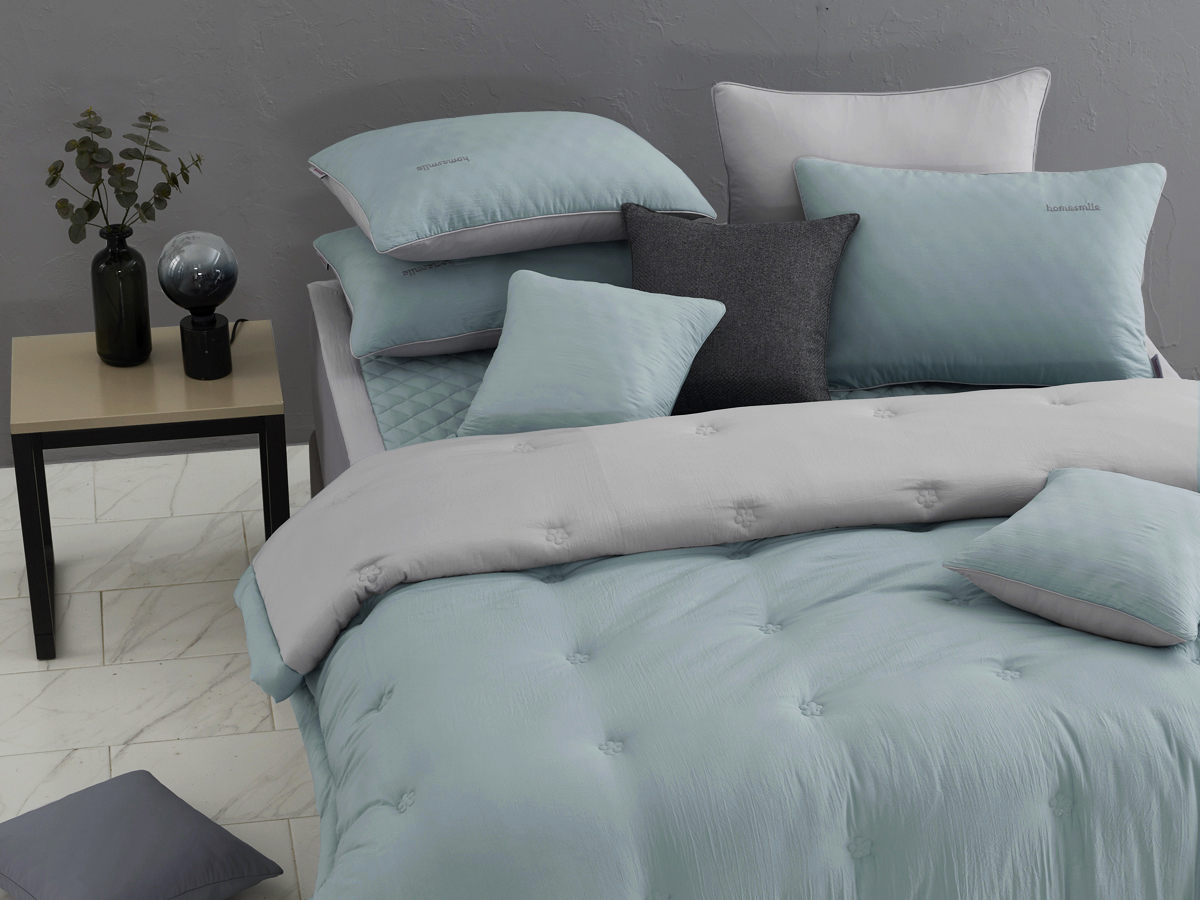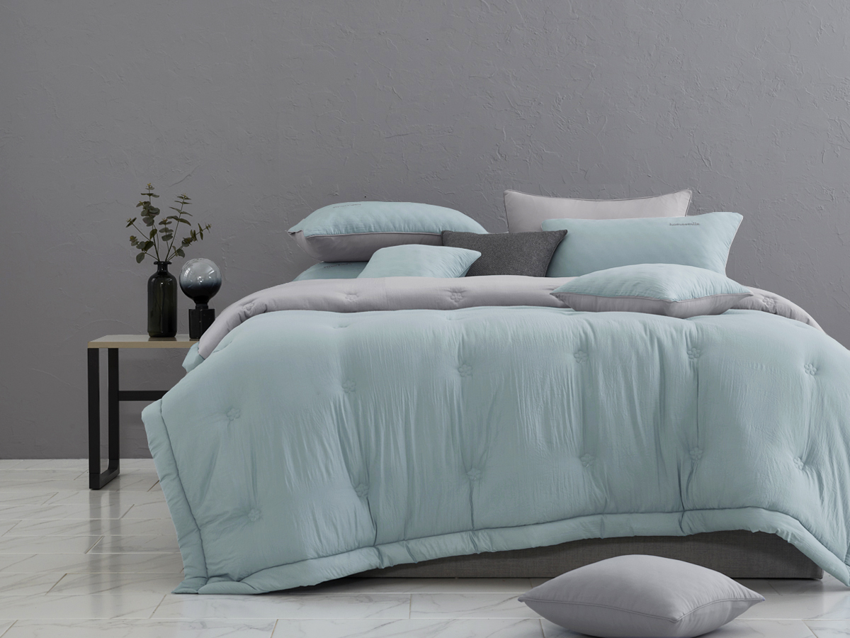 모던한 솔리드 원단으로 연블루와 그레이 컬러를 앞뒤로 매치해 리버서블이 가능한 침구입니다.