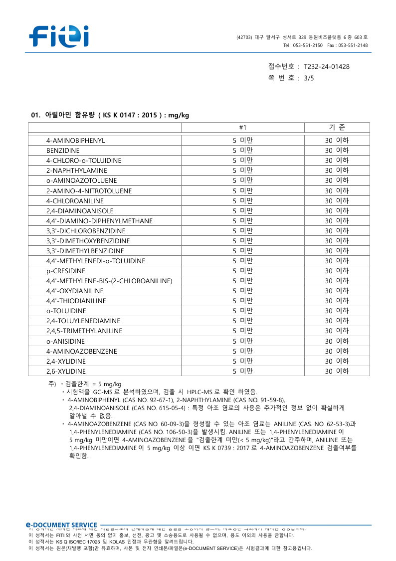 아릴아민 함유량(*)_합격 / 폼알데하이드 함유랸(*) _합격 / PH(*)-합격