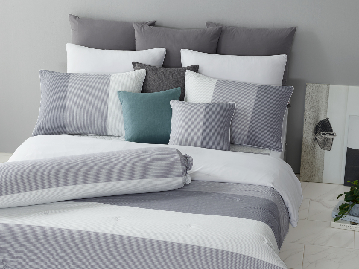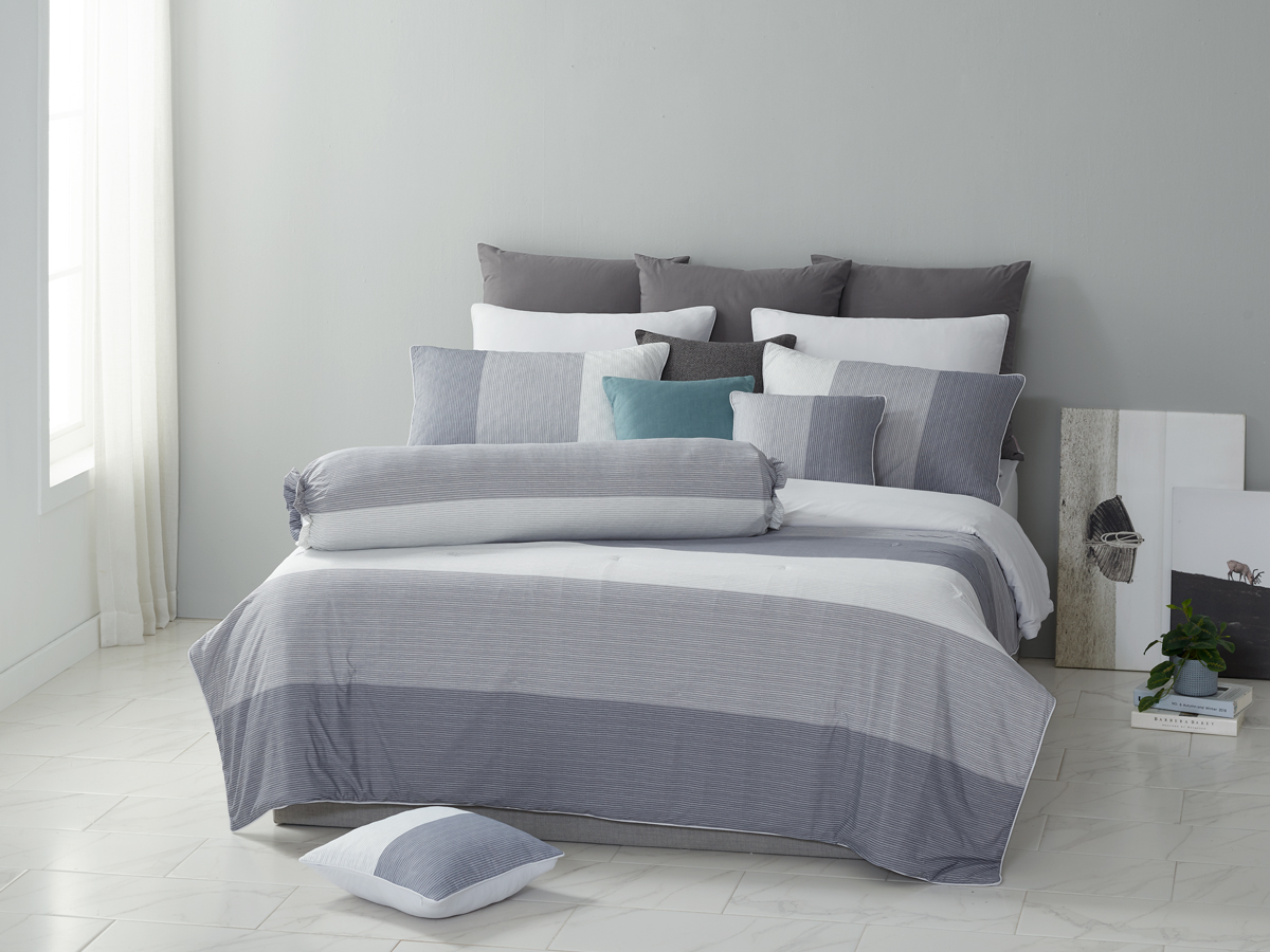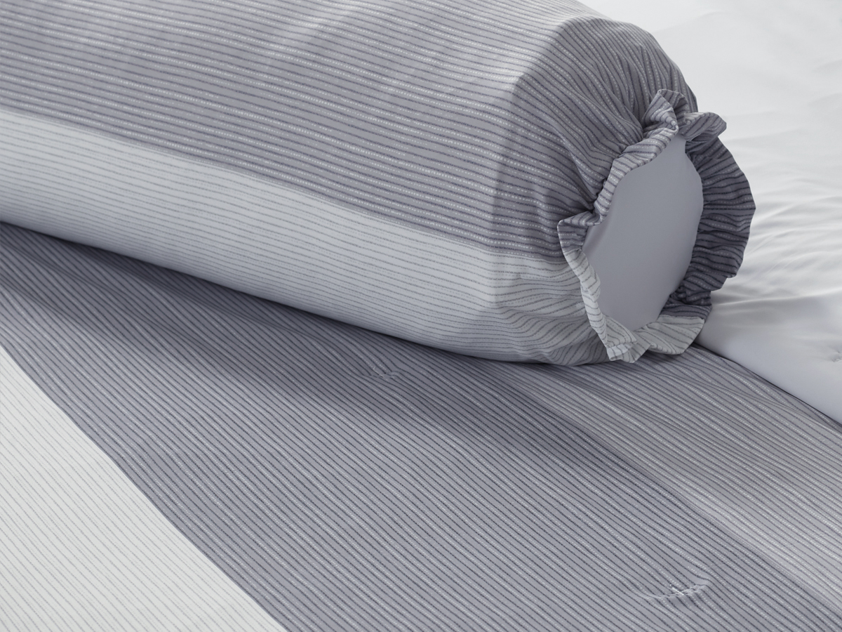 모던한 그레이 & 화이트 스트라이프 패턴이 침실에 정갈하고 차분한 휴식을 선사합니다.