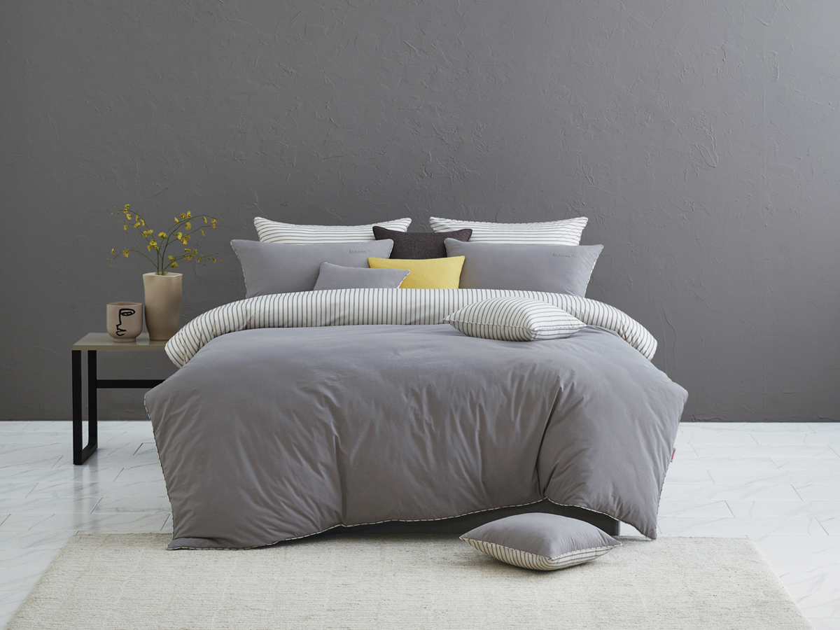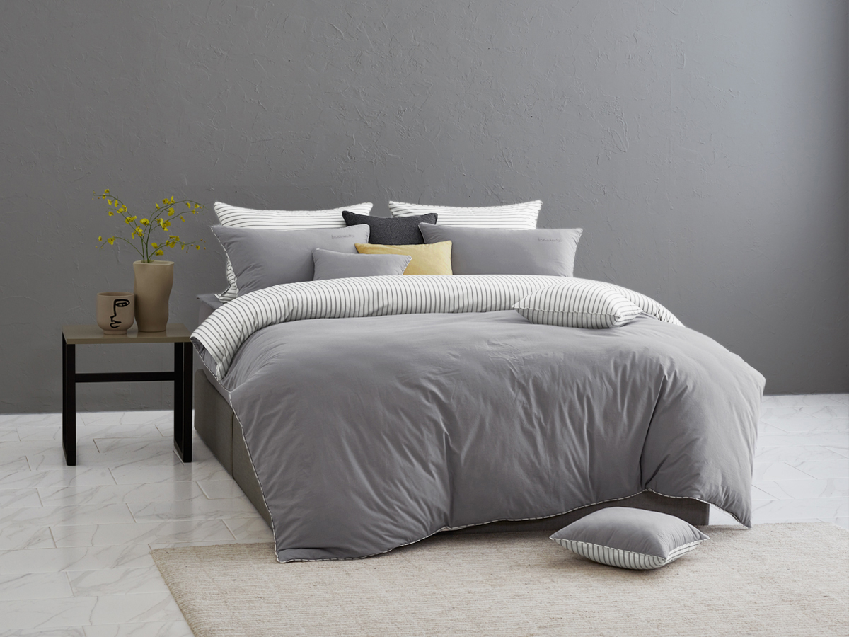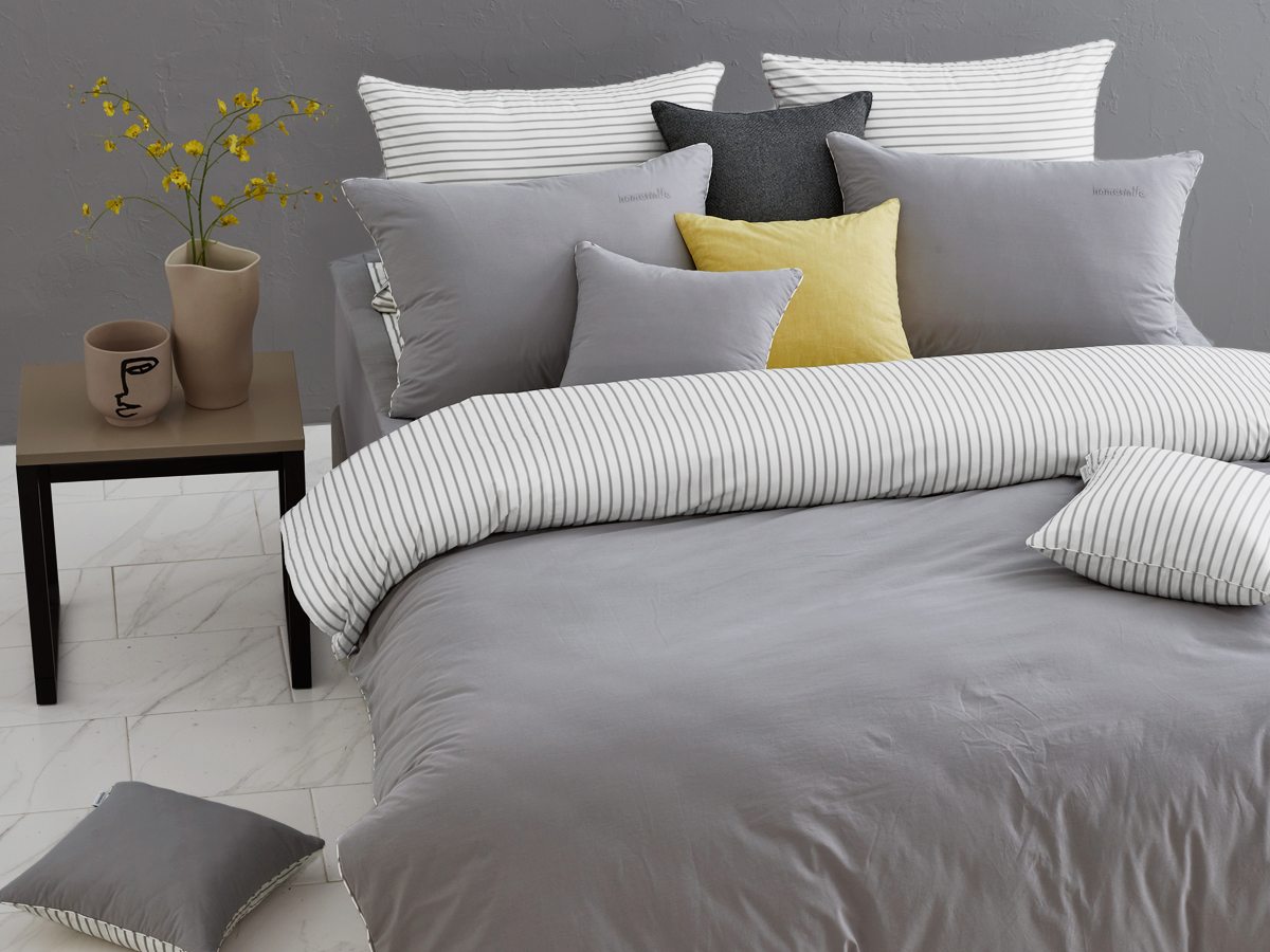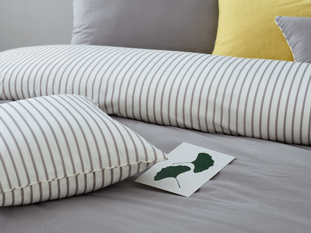 그레이 컬러의 솔리드 원단과 스트라이프 패턴이 차분하면서도 경쾌한 느낌을 주는 디자인입니다.